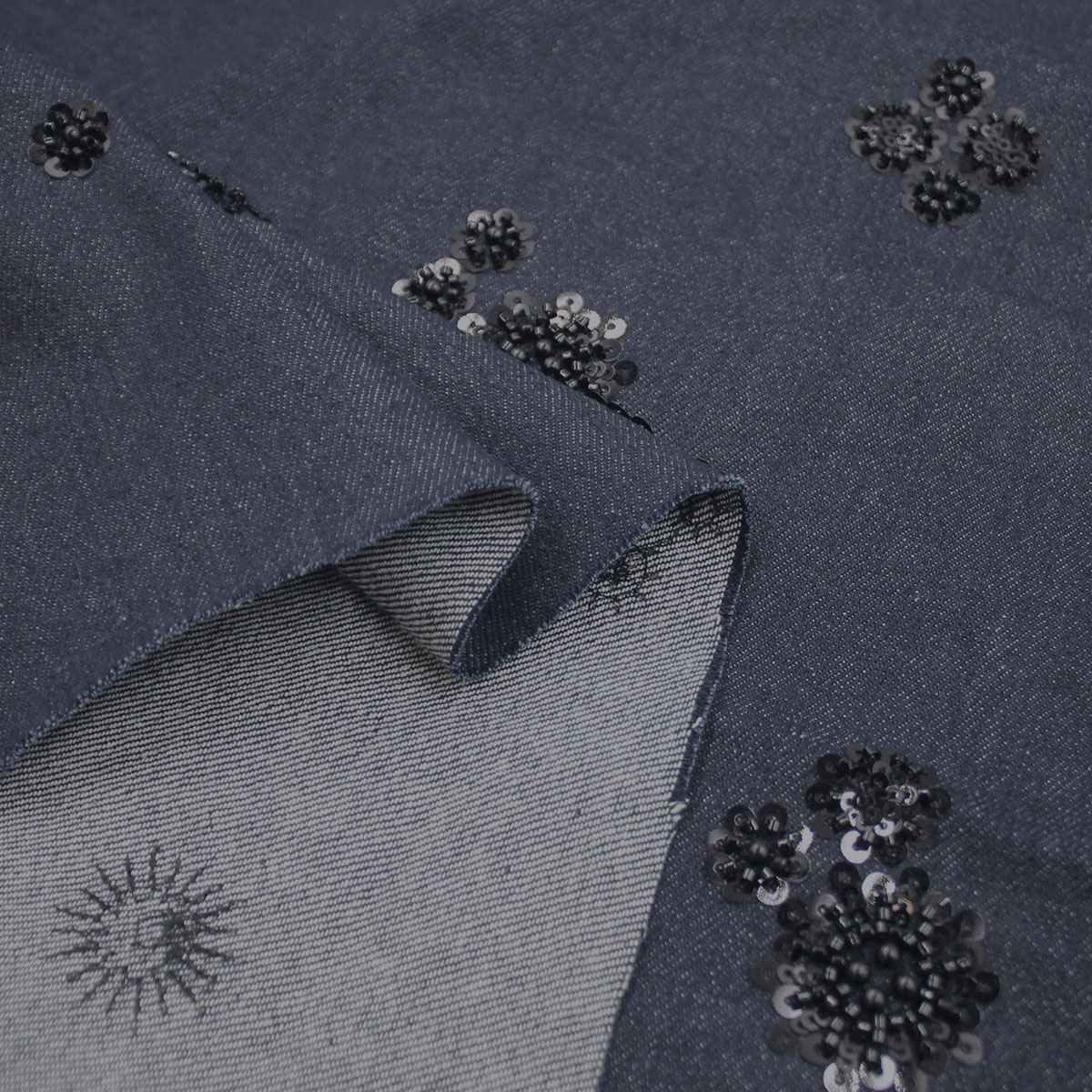 Джинсовая ткань из 100% хлопка с бисером сделает образ привлекательным и стильным. Плотная джинсовая ткань, не стрейч, полностью из хлопковых волокон, которые хорошо держат форму. Ткань обычно имеют прочную структуру, характерную для джинсовой ткани, и при этом украшена красочными цветочными узорами из бисера.