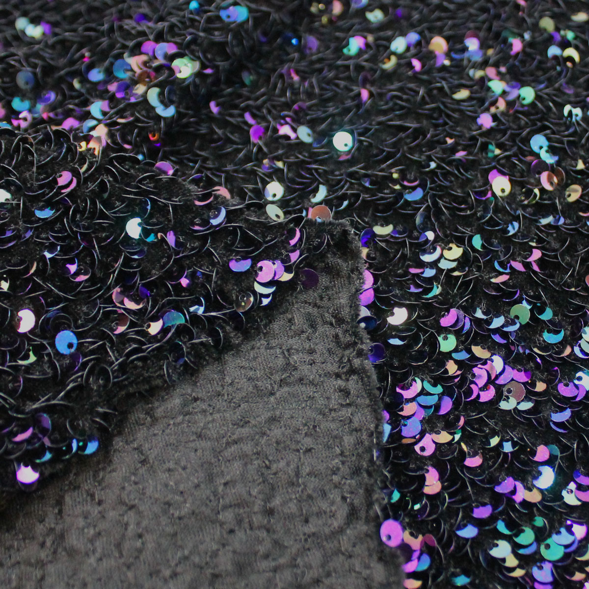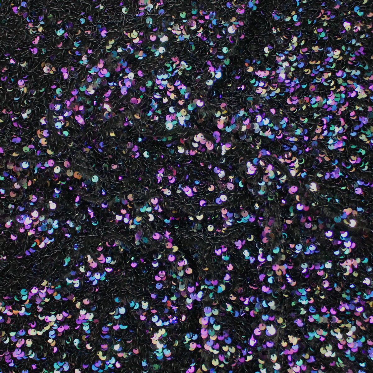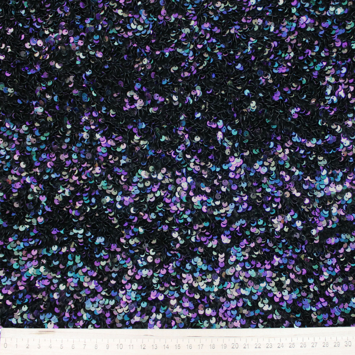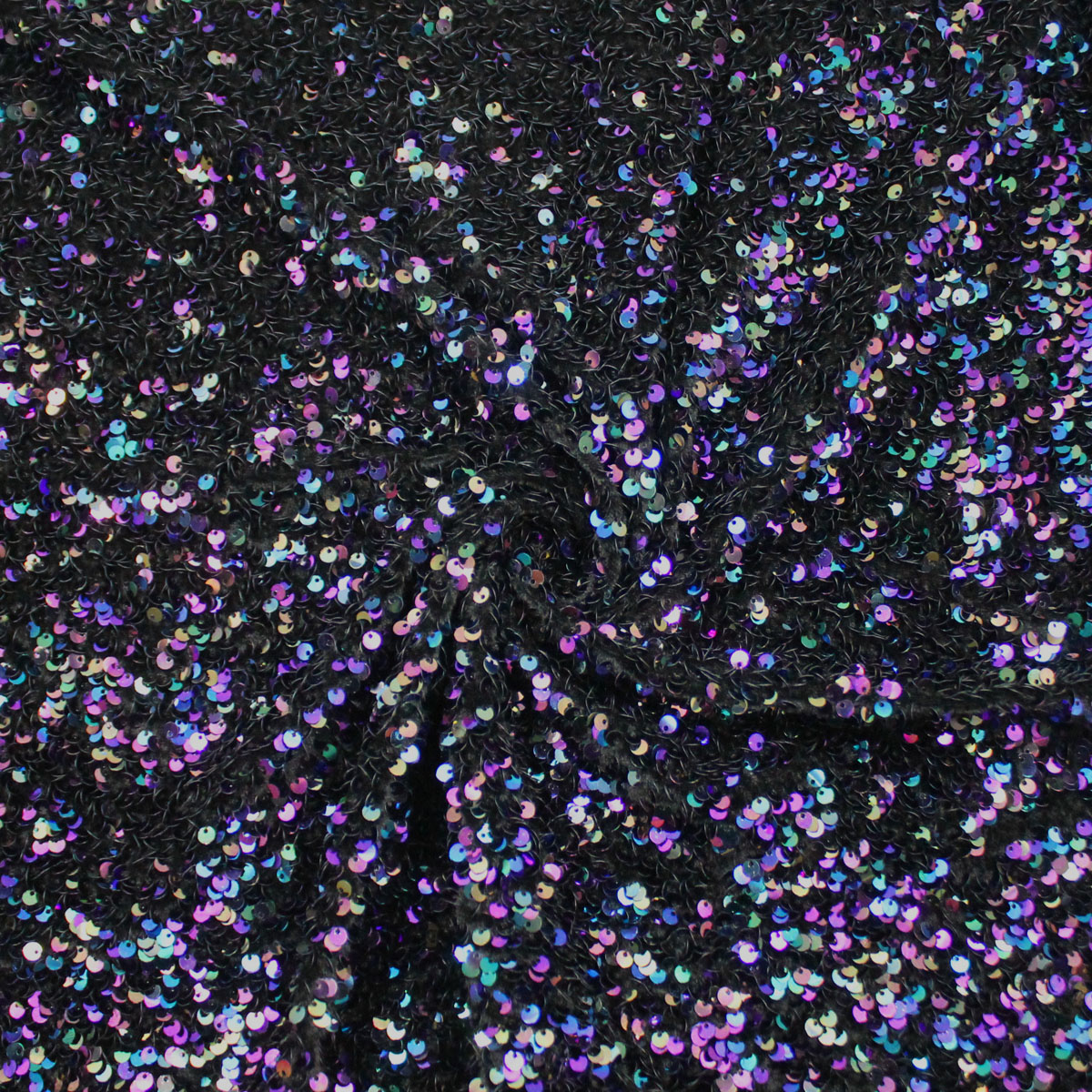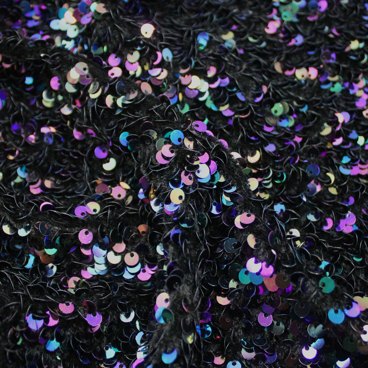 Бархатная ткань черная с пайетками — это роскошный и насыщенный материал, который часто используется для создания элегантной и торжественной одежды.