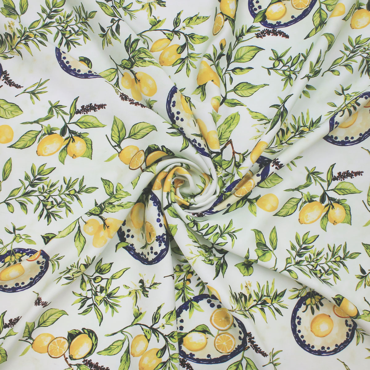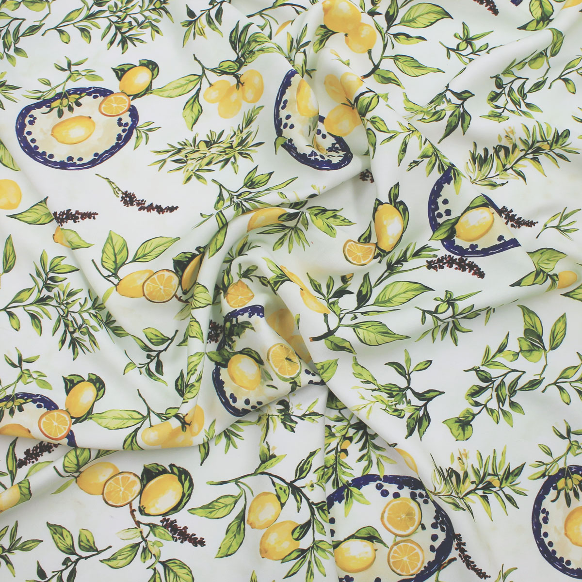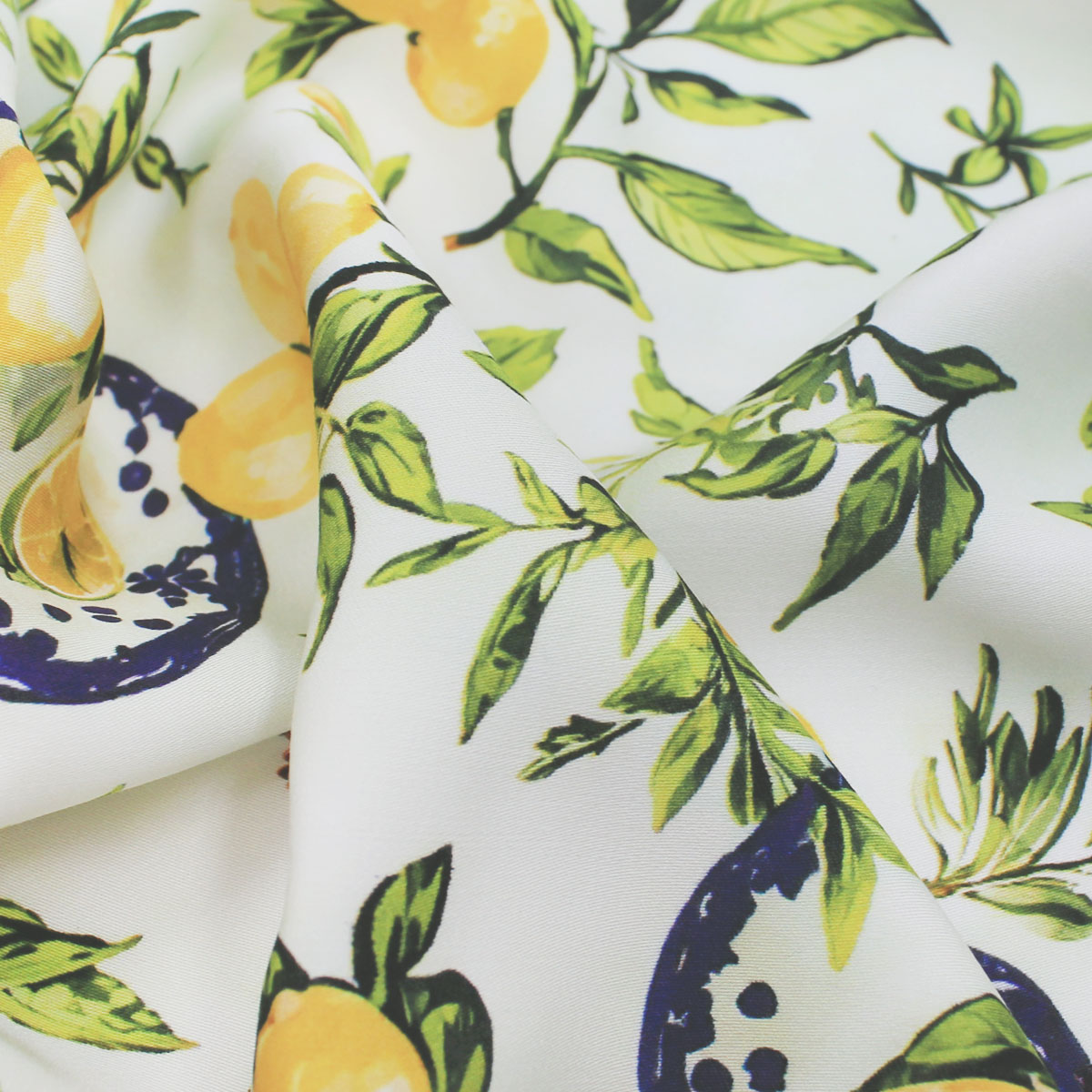 Сияющая, мягкая и невероятно драпируемая сатиновая ткань из вискозы с изысканным растительным принтом — идеальный выбор для создания роскошной одежды и декоративного текстиля.