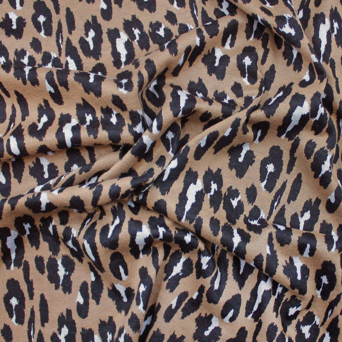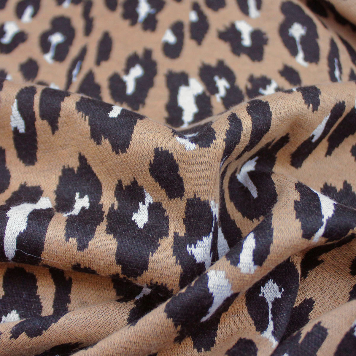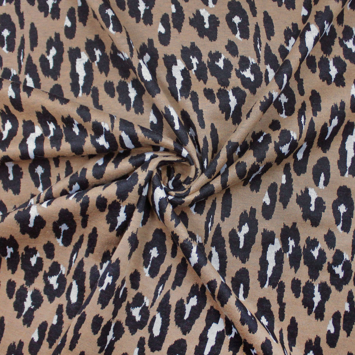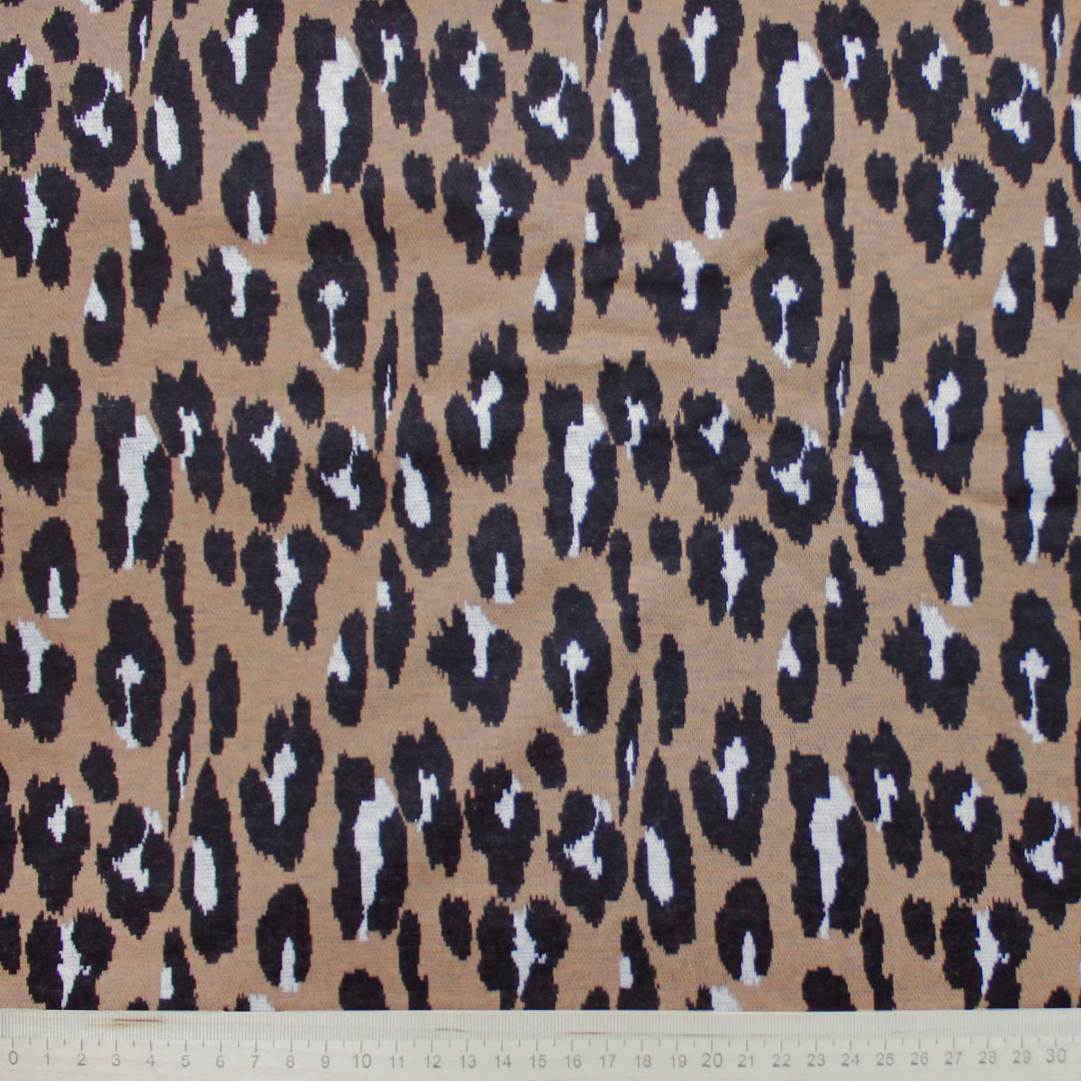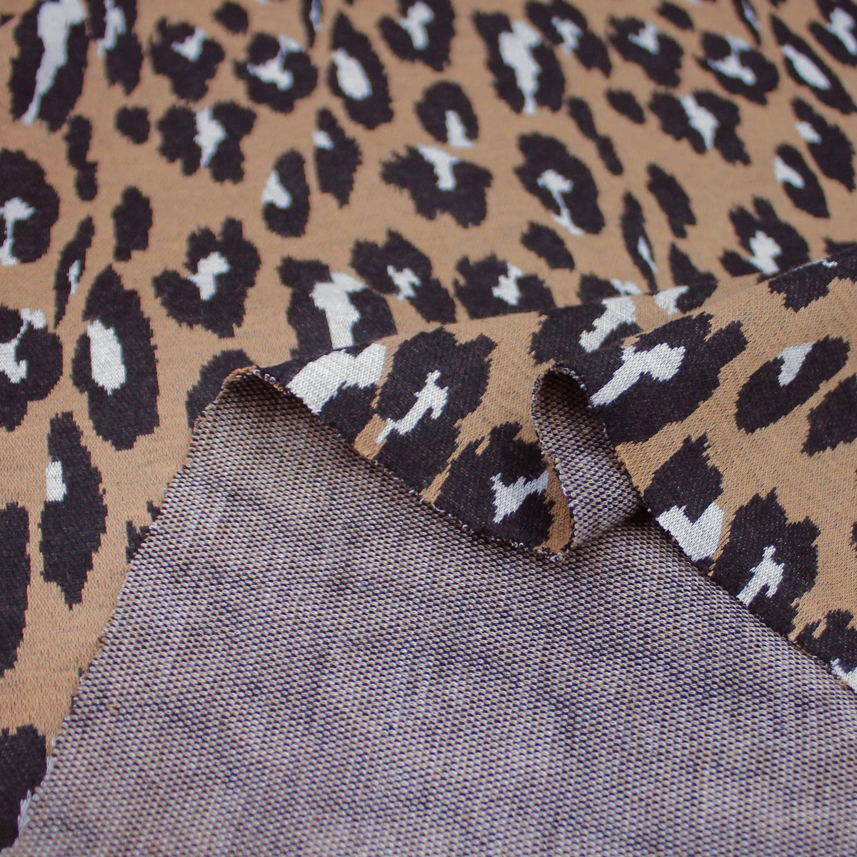 Трикотаж жаккардовый с анималистическим принтом с составом 95% Полиэстер, 5% Эластан — это мягкая, эластичная и комфортная ткань, идеально подходящая для повседневной одежды, такой как блузки, платья и юбки.