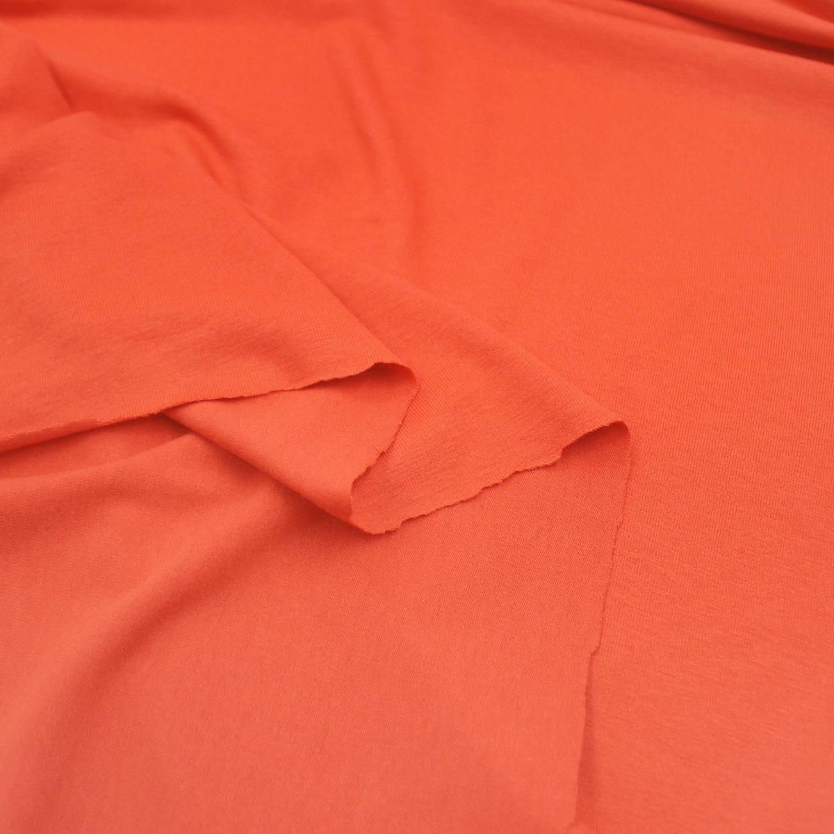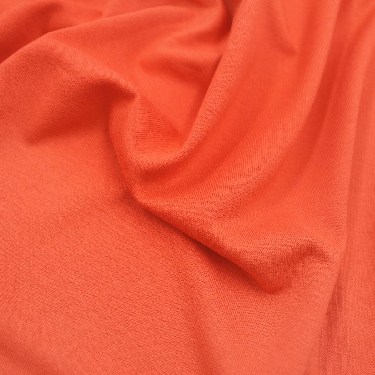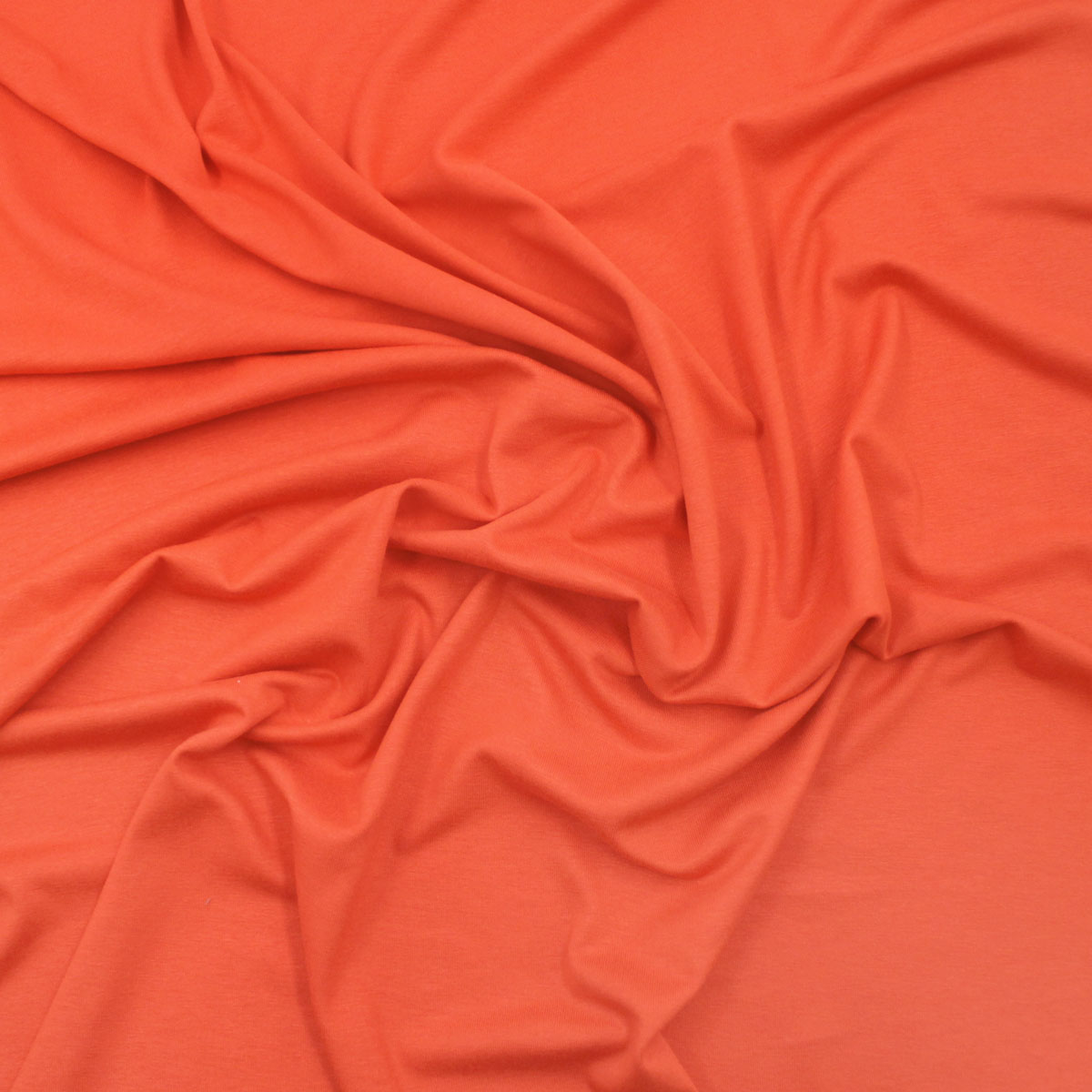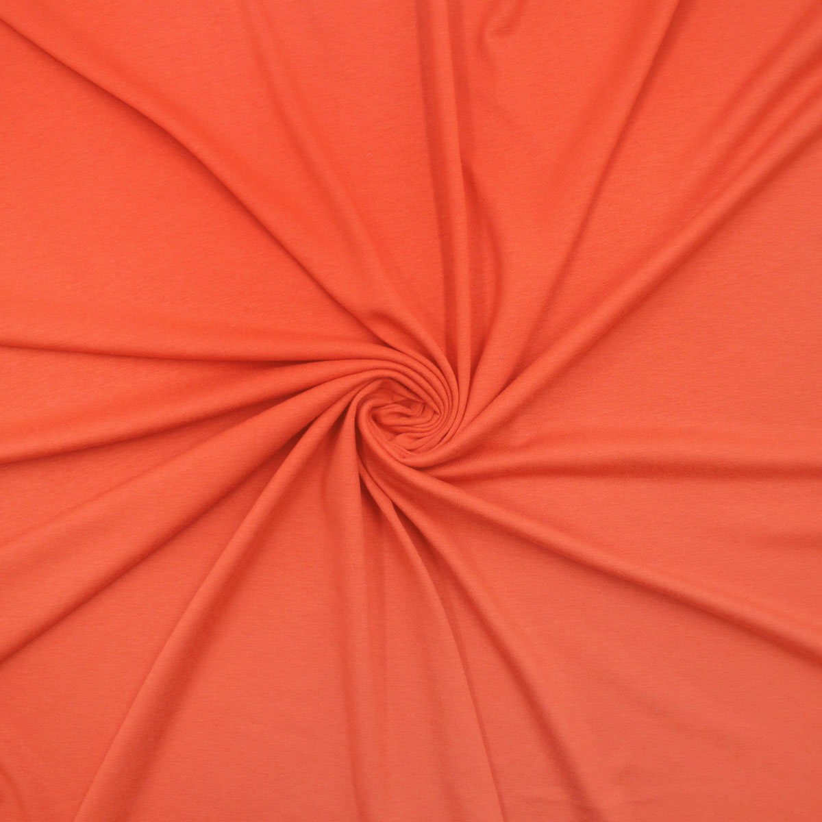 Трикотажное полотно оранжевого цвета изготовлено из вискозы, полиэстера и эластана.