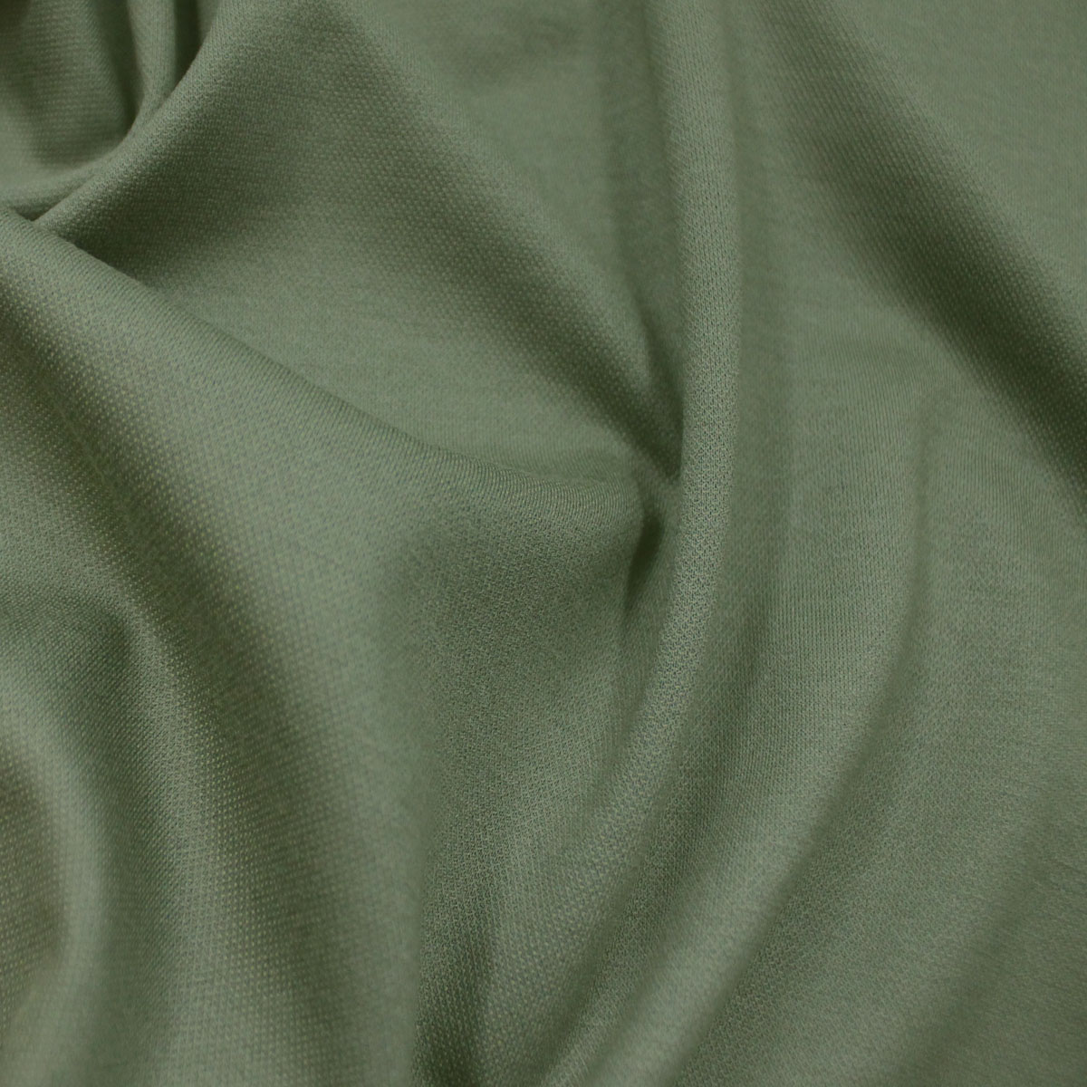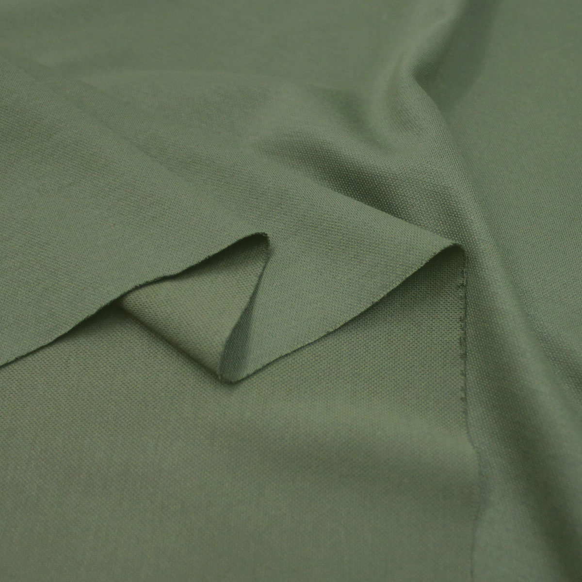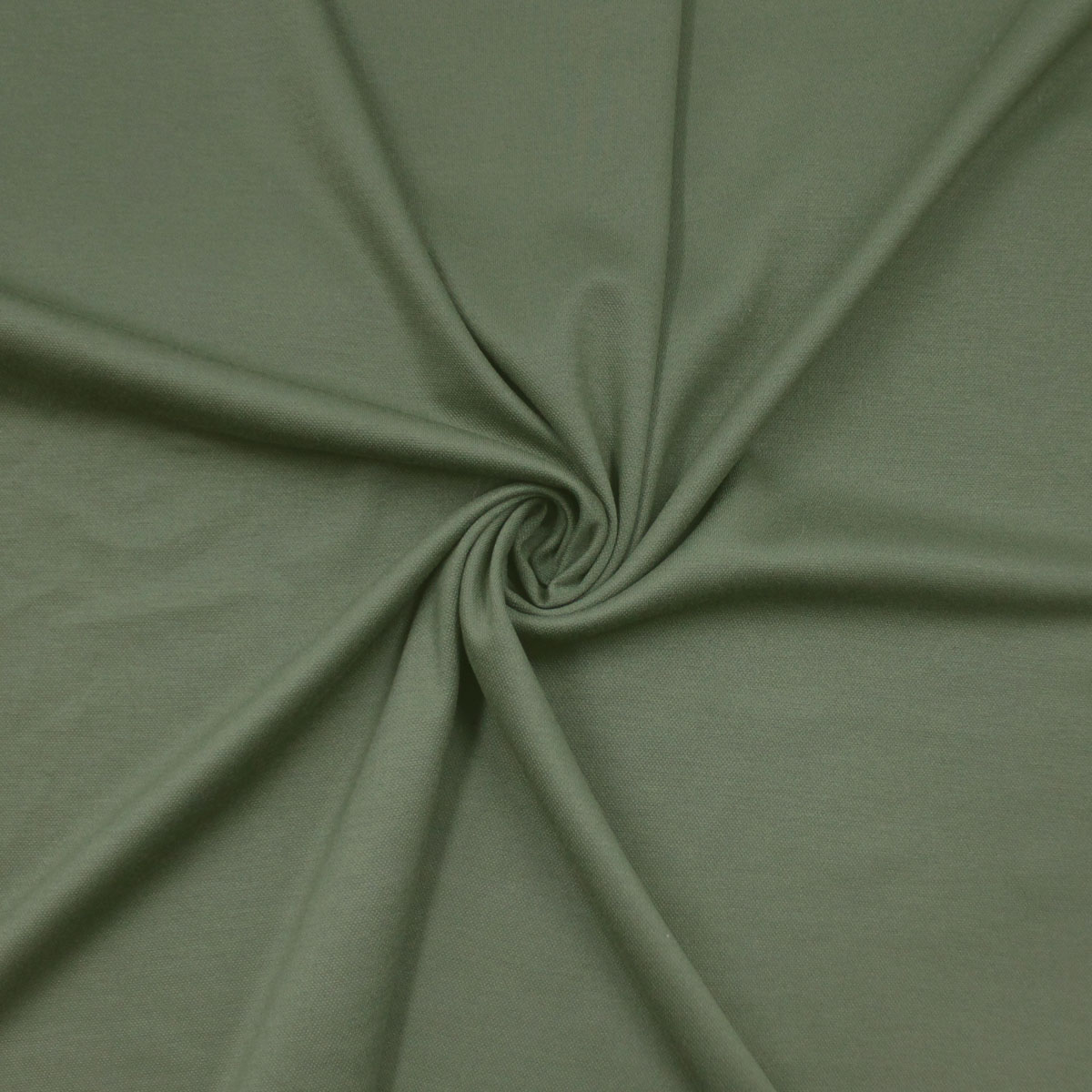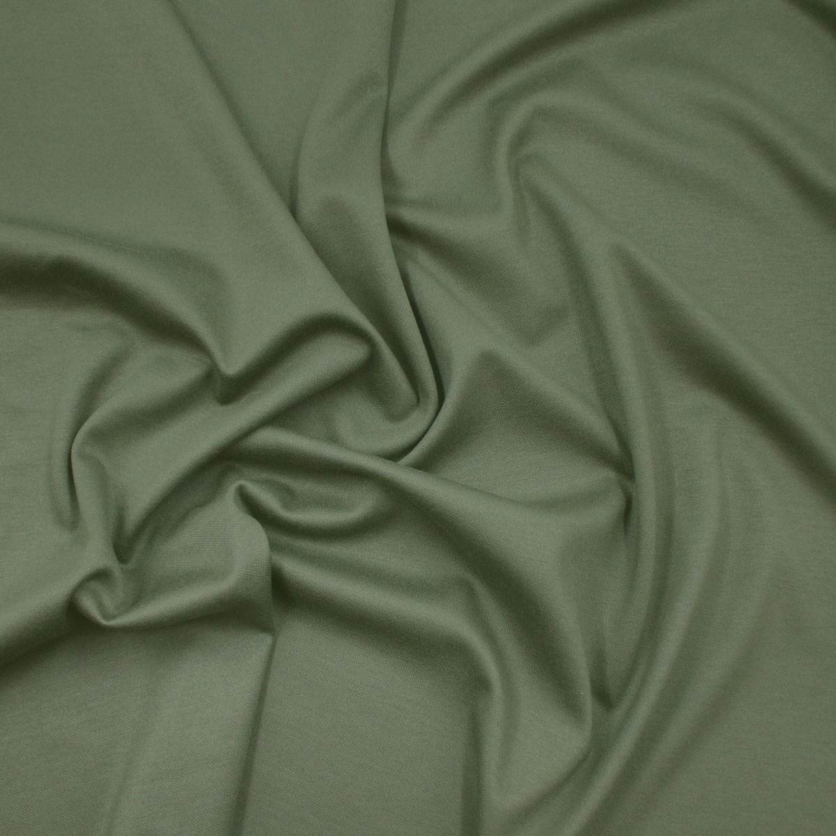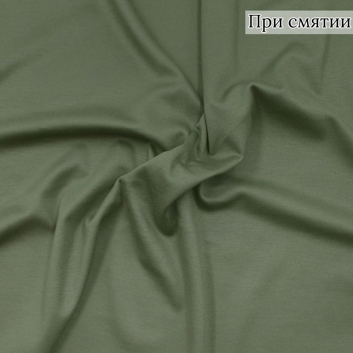 Трикотажная ткань цвета хаки отличается плотностью и эластичностью. Она хорошо сохраняет форму изделия, очень приятная на ощупь, гладкая и мягкая и состоит из 45% Вискоза, 50% Полиэстер, 5% Эластан