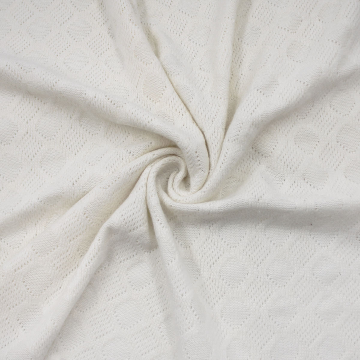 Ажурный трикотаж сливочного цвета с составом 6% Шерсть, 20% Вискоза, 22% Нейлон, 25% Полиэстер, 27% Акрил представляет собой теплый и красивый материал, который хорошо подходит для шитья разнообразной одежды. Вот некоторые особенности трикотажной ткани:
