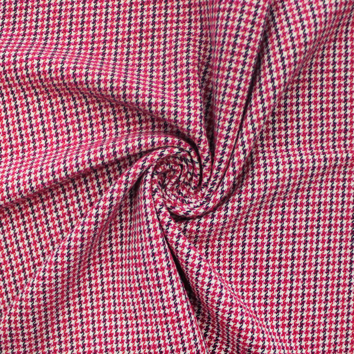 Костюмная ткань красного цвета в "гусиную лапку" с составом 60% шерсти, 25% вискозы и 15% полиэстера представляет собой качественный материал, который сочетает в себе лучшие свойства этих волокон.