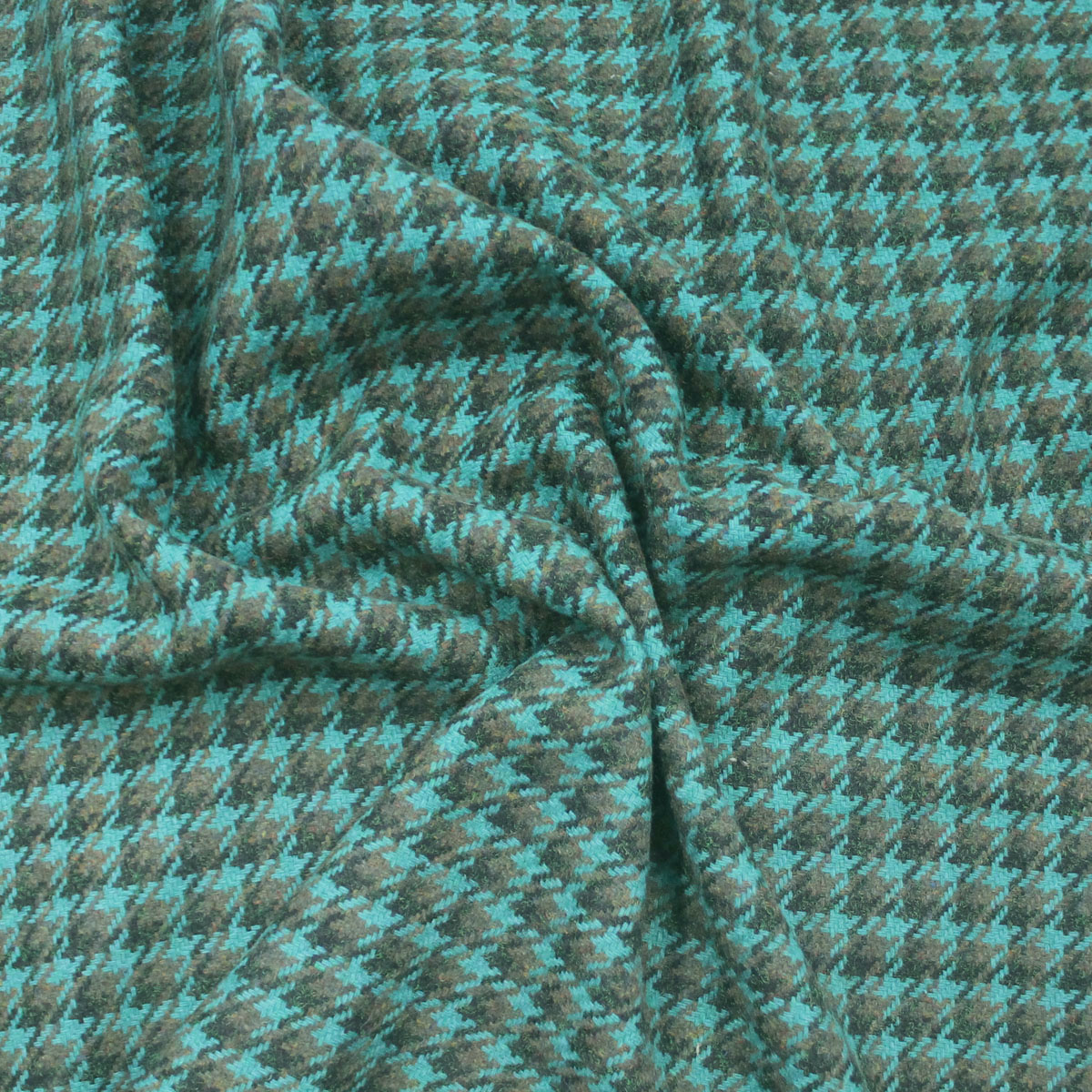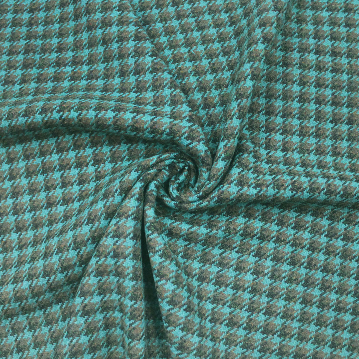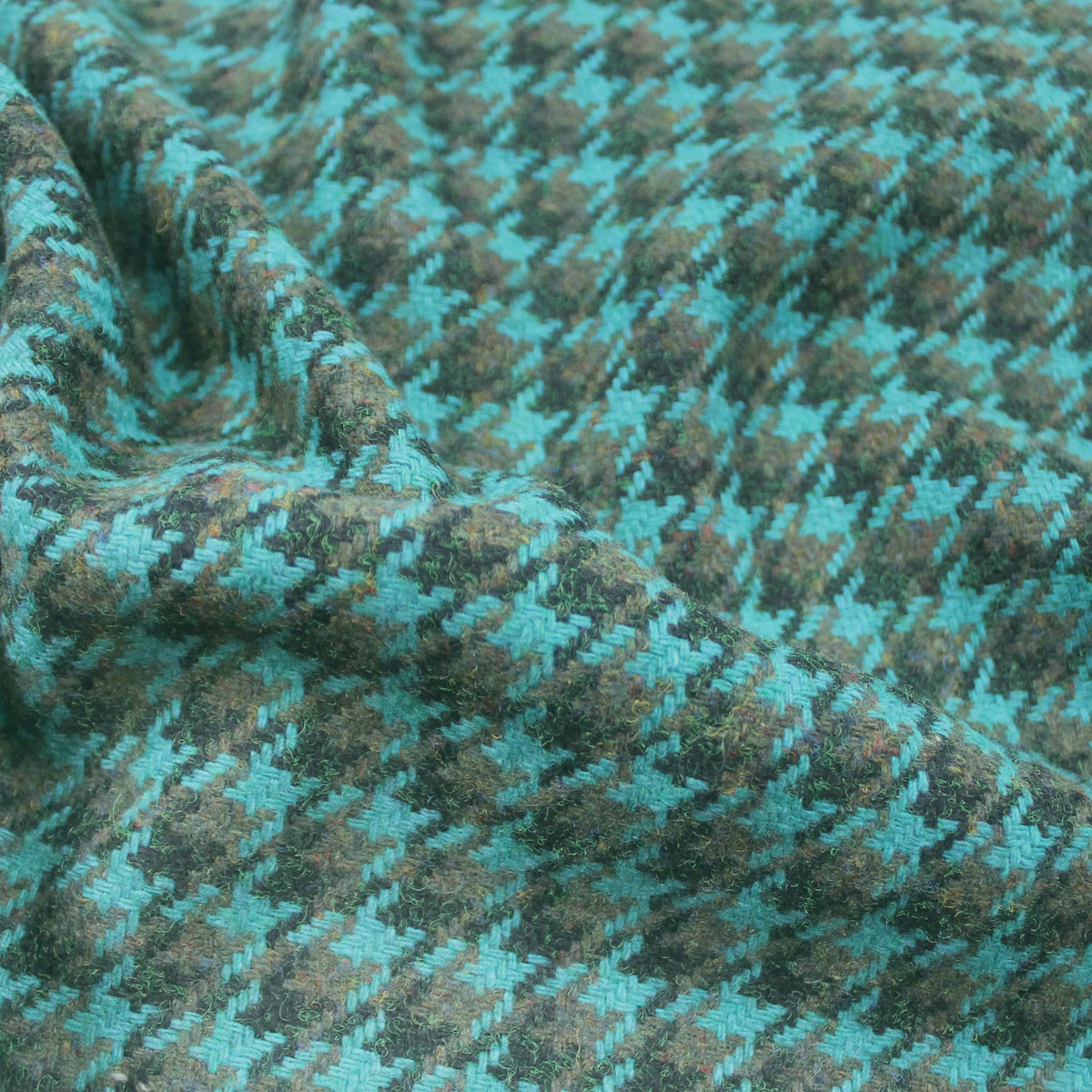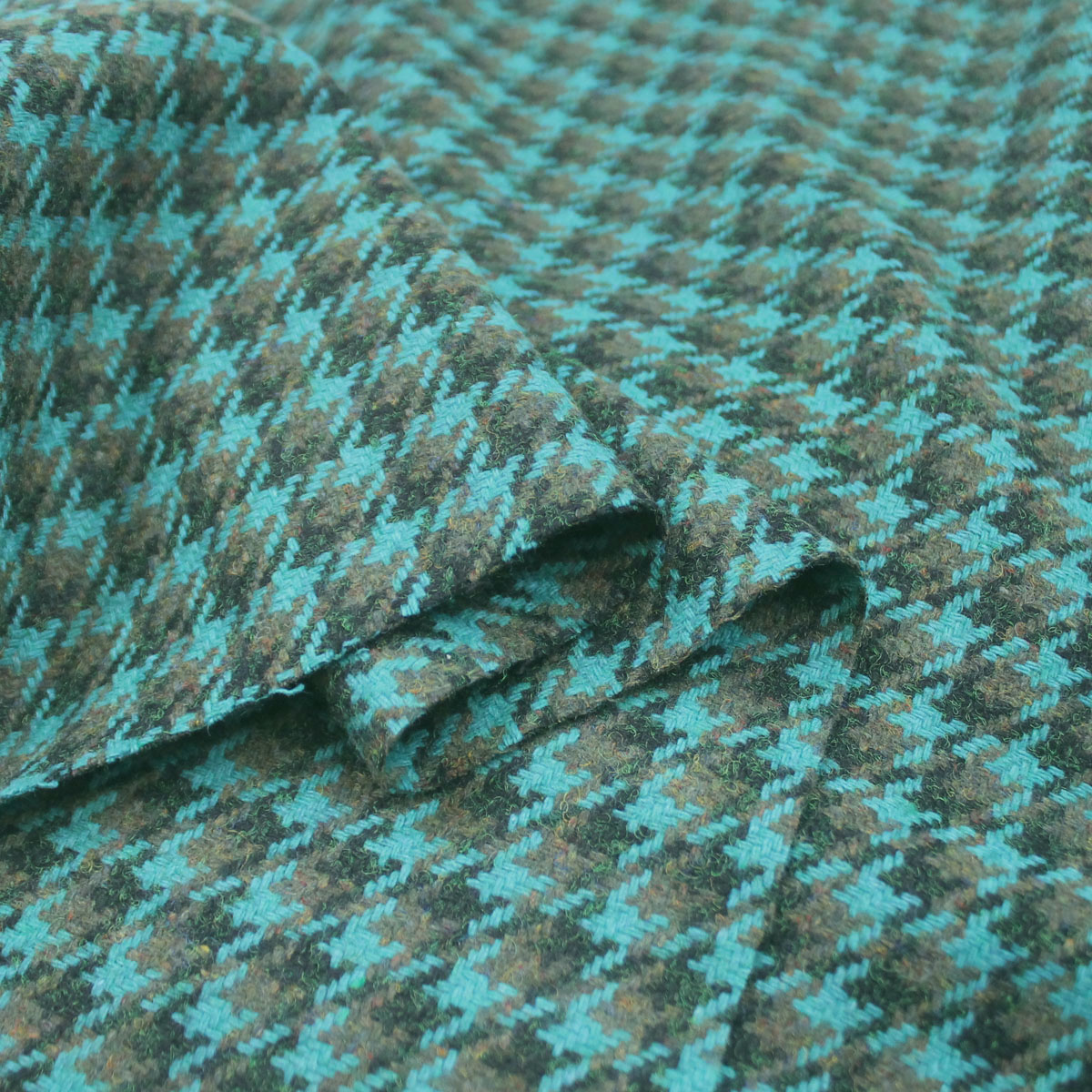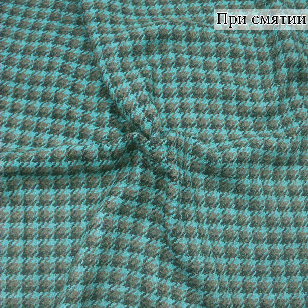 Костюмная ткань в бирюзовую клетку с составом 65% шерсть и 35% полиэстер представляет собой высококачественный материал, который сочетает в себе тепло и прочность шерсти с долговечностью и легкостью ухода полиэстера. Это делает её отличным выбором для деловой и повседневной одежды.