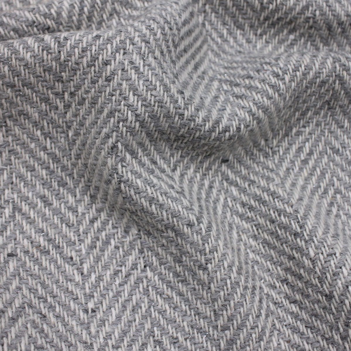 Пальтовая ткань в "елочку" светло-серого цвета с составом 80% шерсти, 1% люрекс и 19% полиэстера предлагает сочетание тепла, которое дает шерсть, и практичности полиэстера.