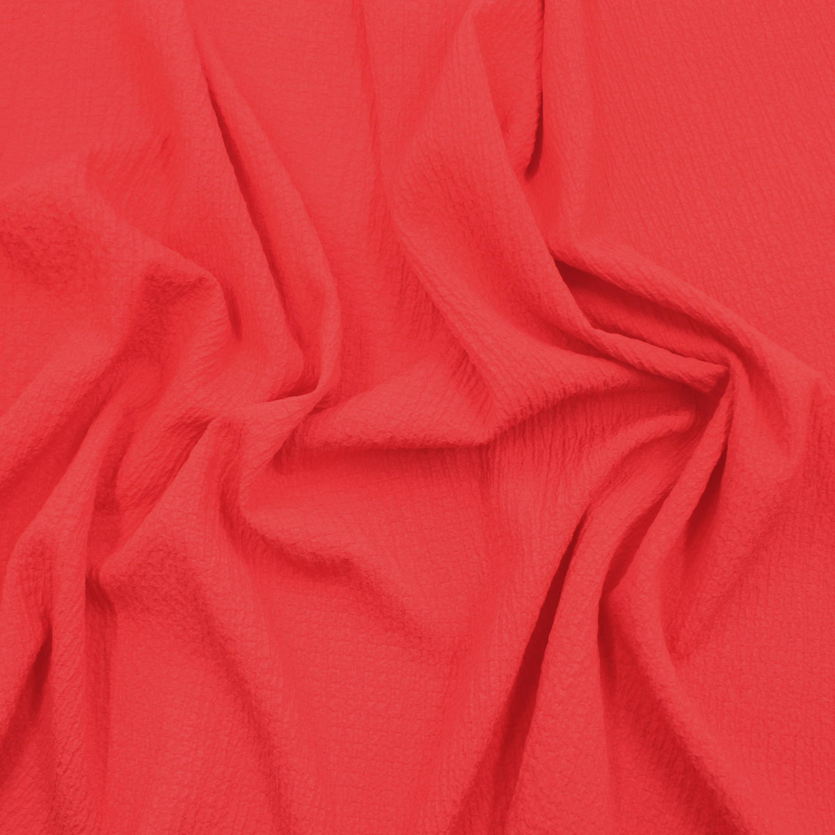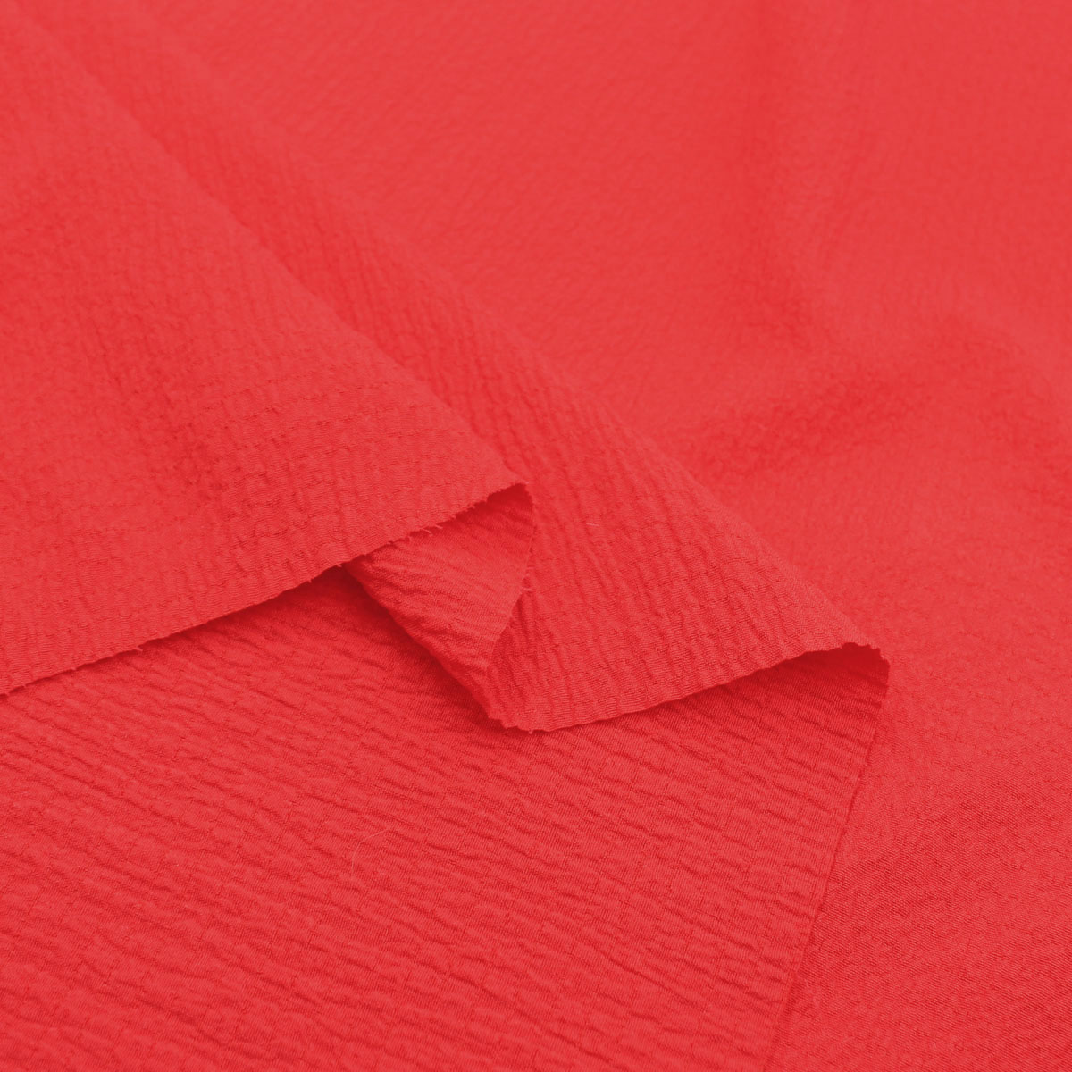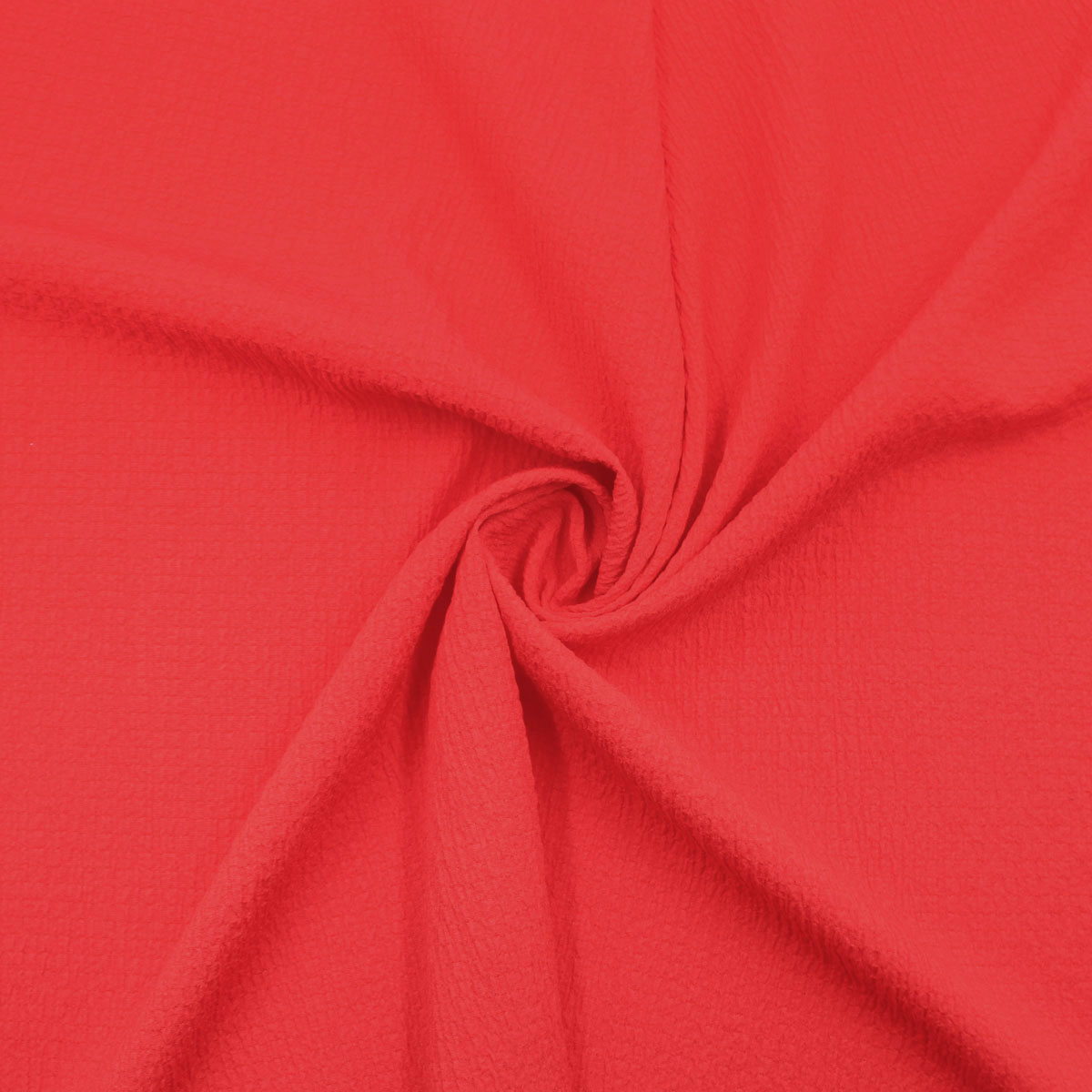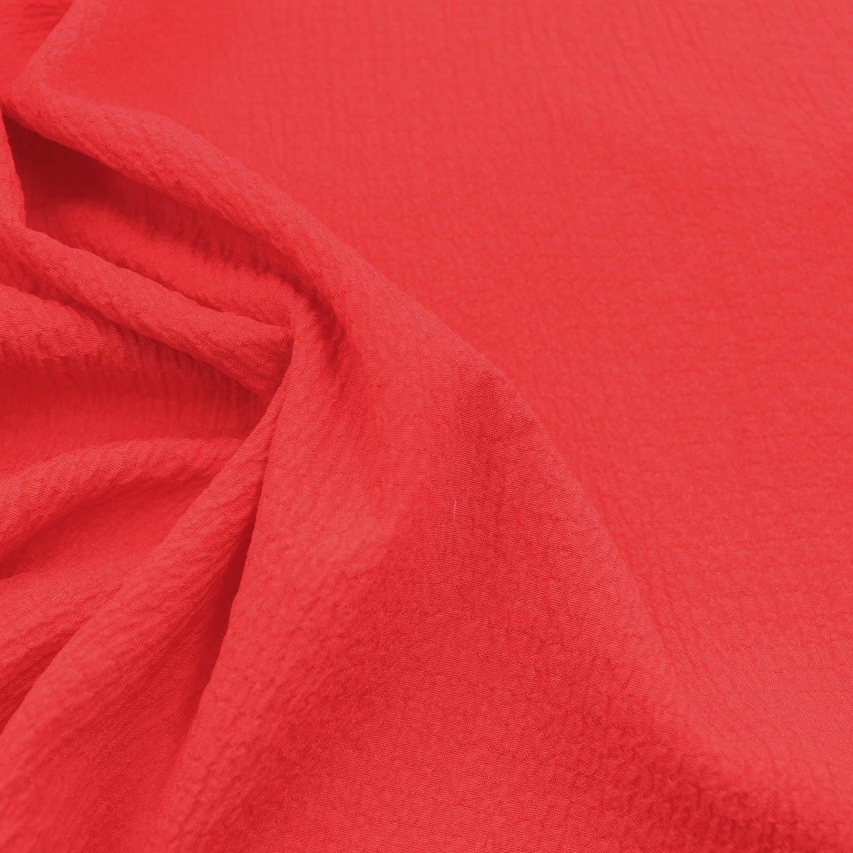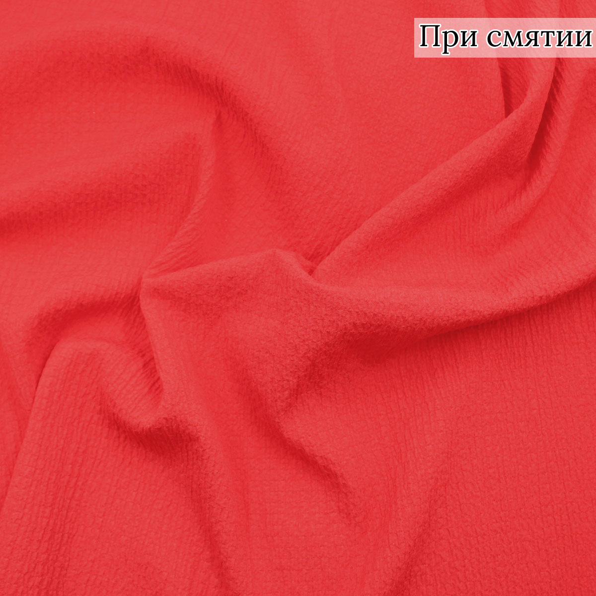 Плательная ткань красного цвета отличается плотностью и эластичностью. Она хорошо сохраняет форму изделия, очень приятная на ощупь, гладкая и мягкая, ткань состоит из 52% Вискозы, 46% Полиэстера, 2% Эластана