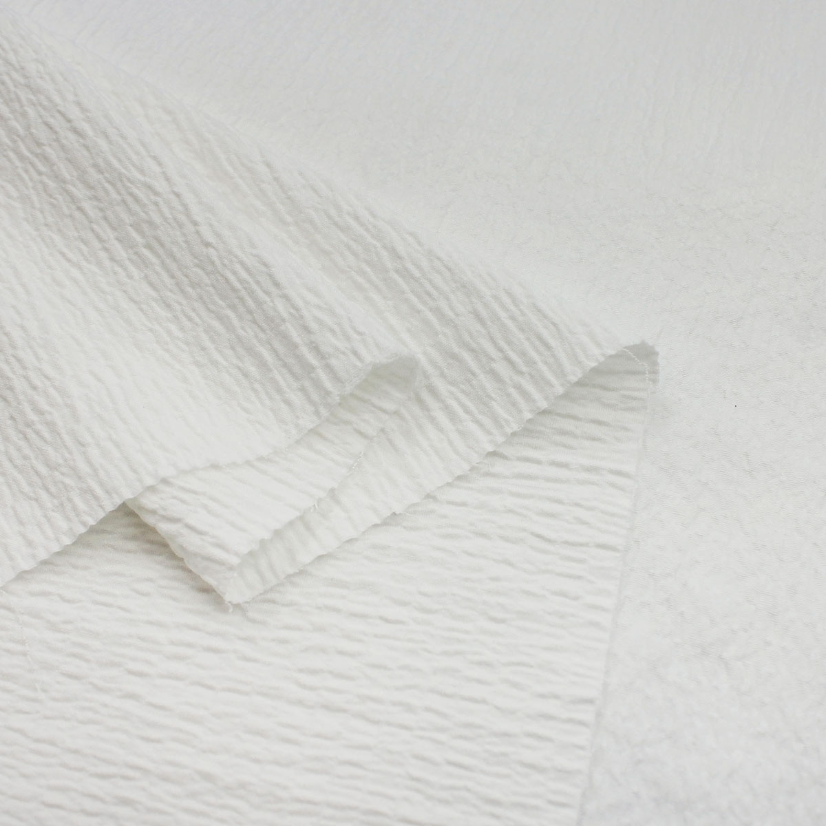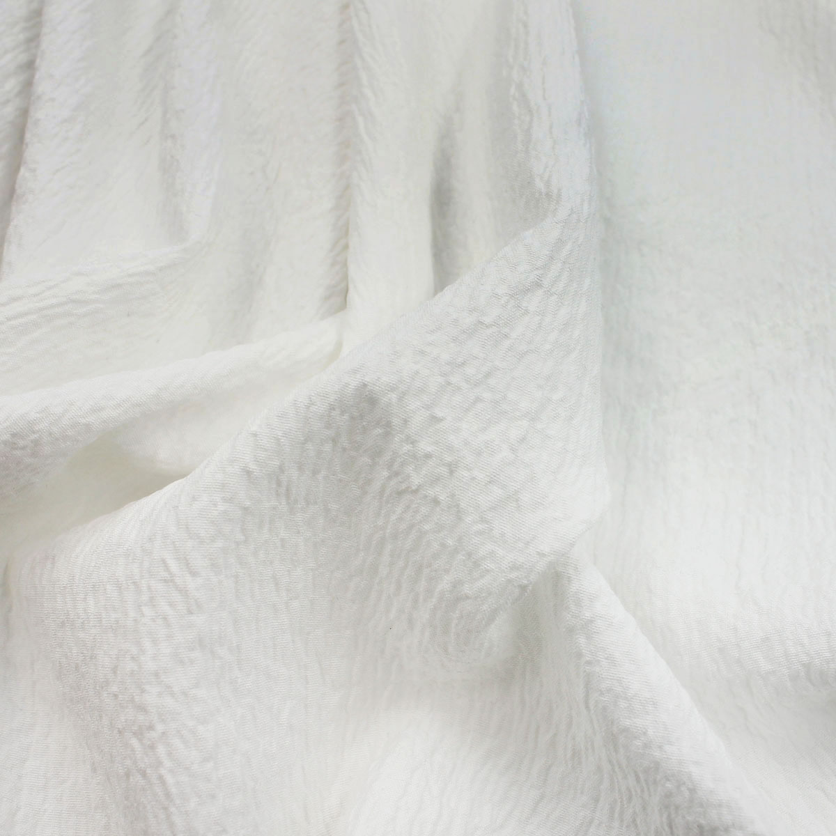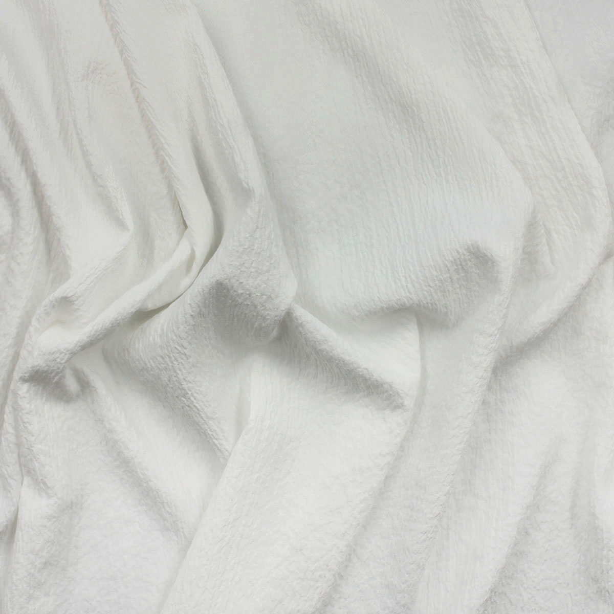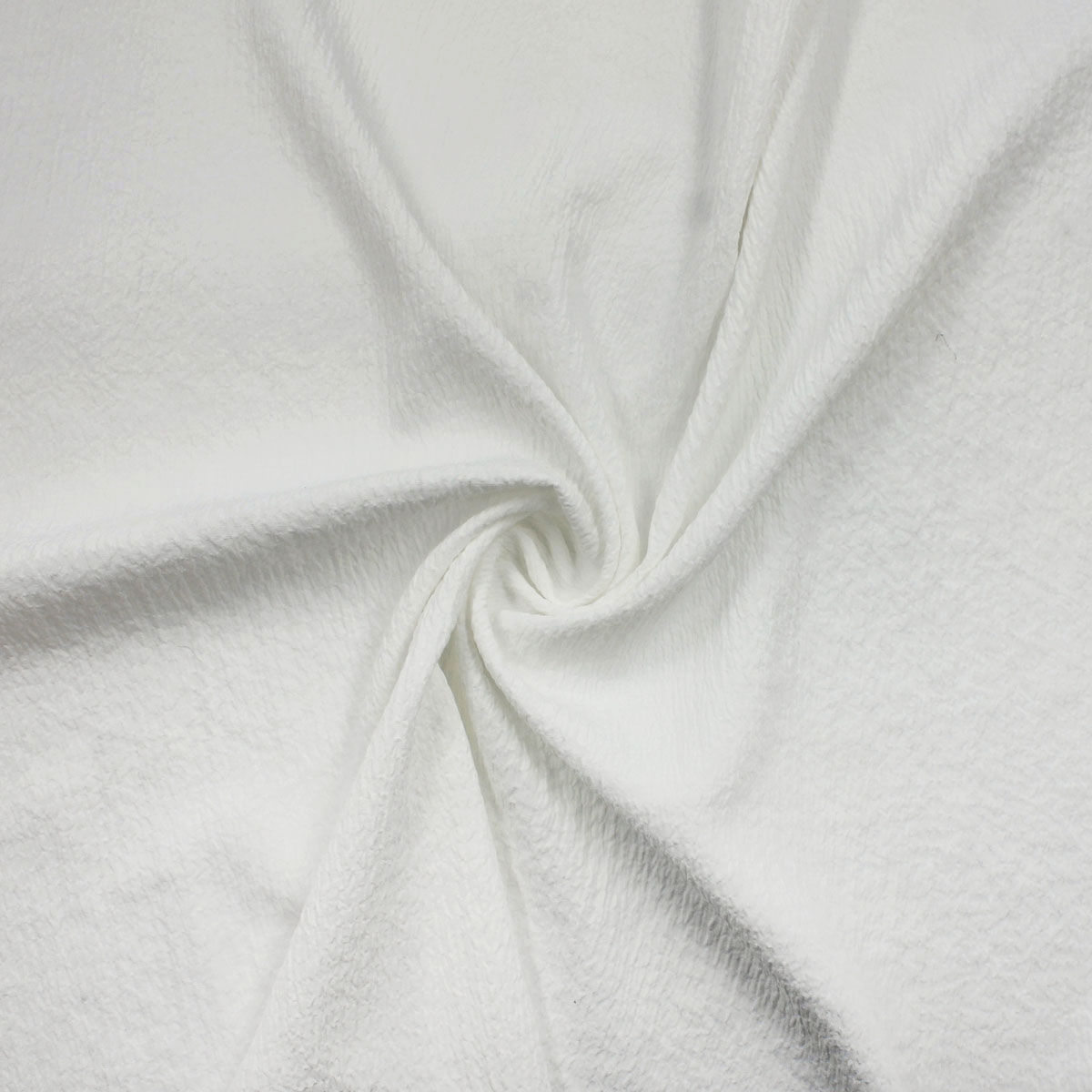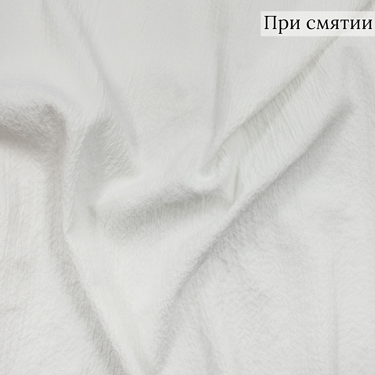 Плательная ткань молочного цвета отличается плотностью и эластичностью. Она хорошо сохраняет форму изделия, очень приятная на ощупь, гладкая и мягкая, ткань состоит из 52% Вискозы, 46% Полиэстера, 2% Эластана
