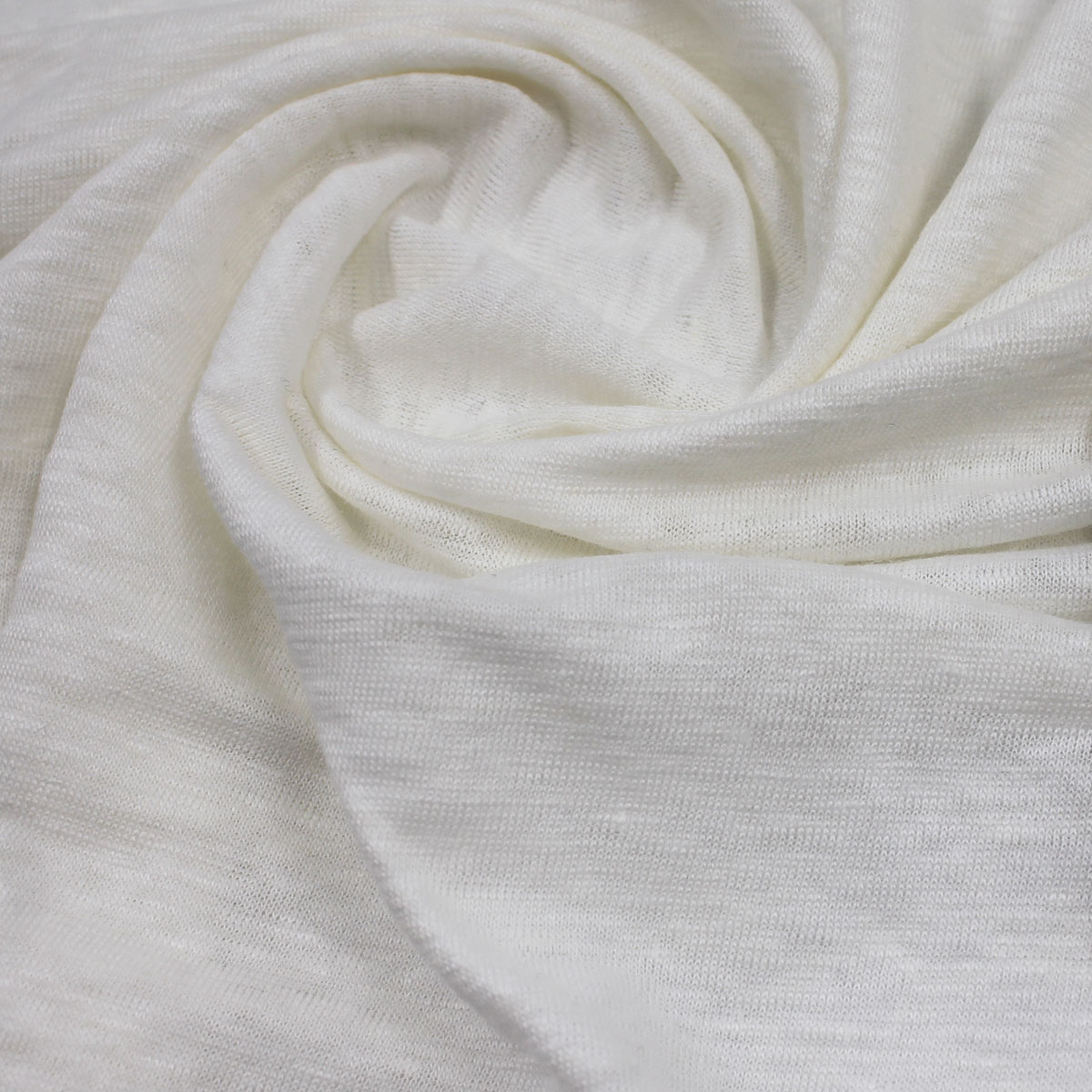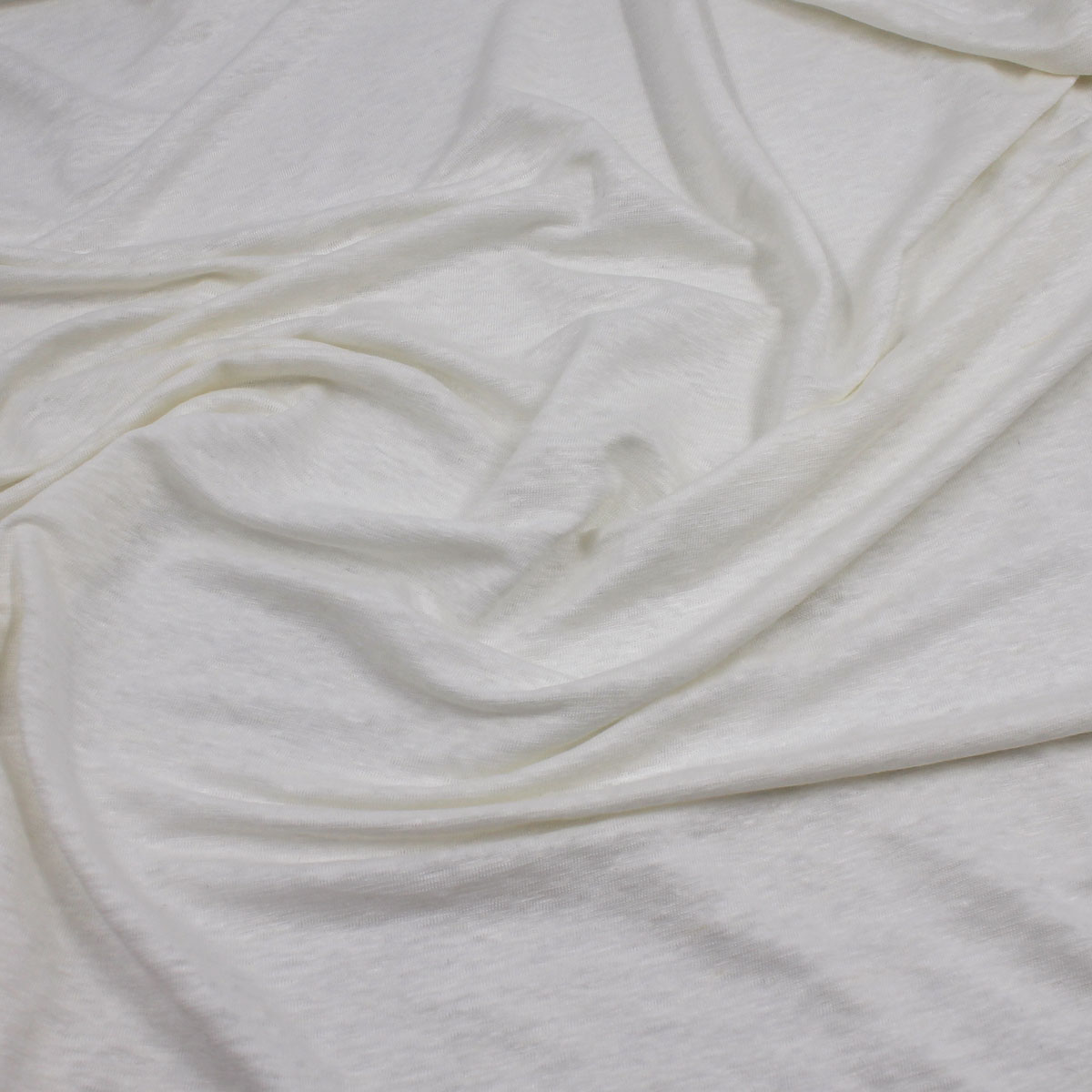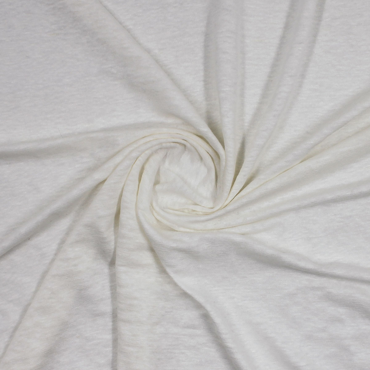 Трикотажное полотно из льна молочного цвета – отличный выбор! Материал хорошо тянется, подходит для облегающих нарядов.